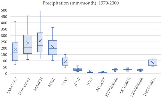 The RF variable corresponds to the monthly precipitation expressed in millimeters in the region of interest, as shown in Figure 3 [23].
