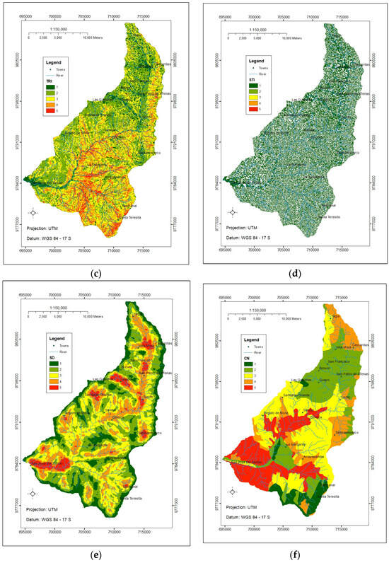 Upon reviewing the maps presented in Figure 5, the following observations can be made: SPI: 62% of the territory shows signs of erosion; TWI: 13% of the territory exhibits areas with significant water accumulation; TRI: 44% of the territory displays a surface that ranges from level to slightly rough, while 23% has a very rough surface; STI: the sediment transport in the basin is minimal; SD: 44% of the soils demonstrate generally high permeability; CN: 33% of the soils have low runoff, while 37% experience from intermediate to high runoff; RD: 4% of the territory is susceptible to fluvial erosion and mass movements due to increased river flows; NDVI: 42% of the vegetation shows signs of varying degrees of stress; RF: 28% of the territory in the upper watershed zone receives lower rainfall compared to other areas.