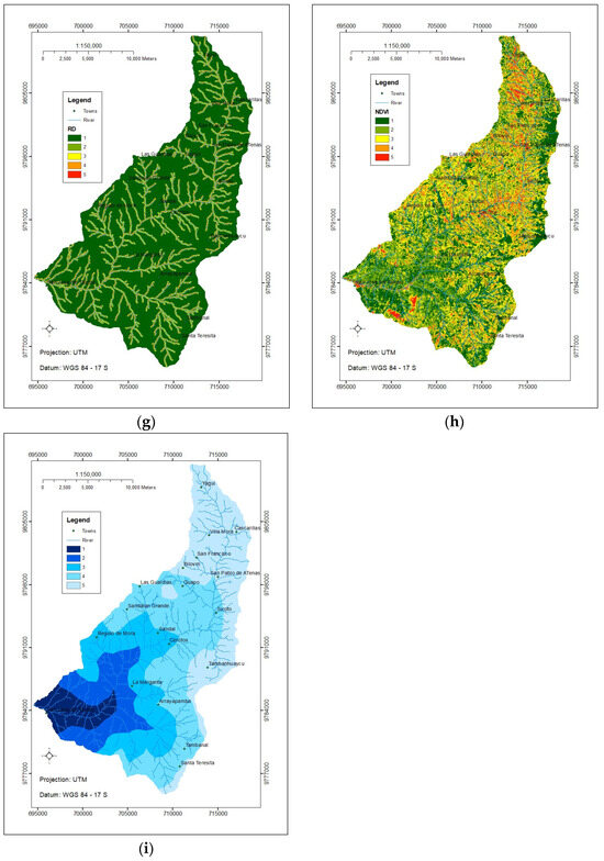 Maps: (a) Stream Power Index; (b) Topographic Wetness Index; (c) Topographic Roughness Index; (d) Sediment Transport Index; (e) Stream Density Index; (f) Curve Number Index; (g) River Distance Index; (h) NDVI; (i) Rainfall Index.