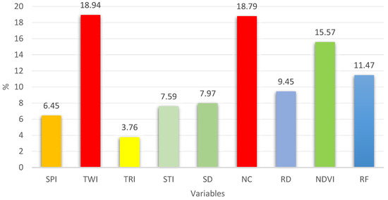 Considering the results obtained by the AHP method in the present study, where the SPI, TWI, TRI, STI, SD, CN, RD, NDVI, and RF variables were examined, Table 9 and Table 10 present the evaluations of the factor pairs and the results of the weighted variables. To derive the Consistency Index (CI), Equation (7) was applied, where “n” represents the number of factors (n = 9) and “” denotes the average value of the consistency vector, as detailed in Table 11. Thus, the CI calculation result was 0.06 [43]: