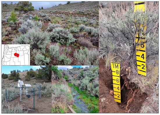 The location of the study site in Crook County, central Oregon, is indicated in the outline map (not to scale) of the state of Oregon, USA. Images taken in 2023 show the distribution of sagebrush throughout the study site. In (a), sagebrush now occupies the landscape where juniper trees were removed in 2005. The study site’s monitoring station for soil moisture, temperature, precipitation, and plant transpiration variables is shown in (b). The presence of sagebrush plants next to the stream near the monitoring station is illustrated in (c). The depth of the root zone for a 1.2 m tall sagebrush plant at the study site is shown in (d).