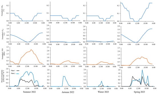 Figure 2 shows the diurnal variation in normalized SMtot, STtot, VPD, and branch-level transpiration on four days (19 August, 24 November, 19 February, and 11 May), representative of environmental conditions in summer 2022, autumn 2022, winter 2023, and spring 2023, respectively. Generally, SMtot and STtot peaked in the morning and tapered off throughout the day. Compared to the average environmental conditions of autumn 2022 and winter 2023, greater diurnal normalized SMtot and STtot variations occurred in summer 2022 and spring 2023, indicating relatively higher transpiration rates in those seasons. The VPD increased rapidly in the early morning (between 6:00 and 8:00), peaked at noon (13:00 for winter 2023 and 15:00 for summer 2022, autumn 2022, and spring 2023), then dropped until midnight. Dynamics of transpiration reflected VPD values, but they were not necessarily synchronized. Transpiration increased rapidly in the early morning, reaching peak values (1.7, 1.2, 0.6, and 2.0 g mm−1 h−1) between 10:00 and 15:00 for summer 2022, autumn 2022, winter 2023, and spring 2023 average environmental conditions, respectively. Then, it declined significantly, reaching minimum values of <0.1 g mm−1 h−1 at night. The relatively lowest transpiration rates recorded for autumn 2022 and winter 2023 were attributed to the low atmospheric evaporative demand represented by lower normalized STtot and VPD.