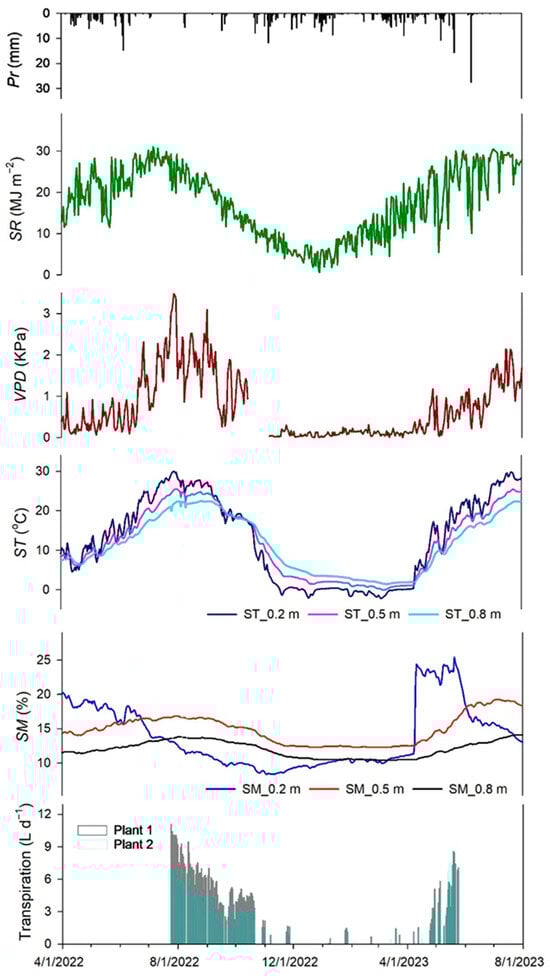 Figure 3 illustrates the daily averaged fluctuations of Pr, SR, VPD, SM, and ST levels between 1 April 2022 and 31 August 2023. Also, it shows the transpiration data collected from 24 July 2022 to 23 May 2023. Total annual precipitation for the two years (2022 and 2023) encompassing this study was highly variable. Below-average precipitation records (278 mm) were obtained in 2022, following five other years of severe drought in the region.