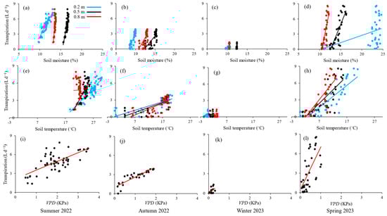 Relationships of transpiration to soil moisture (a–d) and soil temperature (e–h) at various depths, and vapor pressure deficit, VPD (i–l), in summer 2022, autumn 2022, winter 2023, and spring 2023.