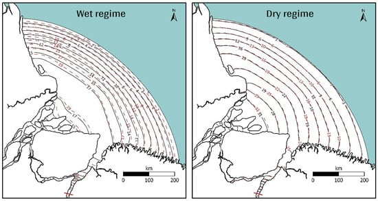 - Second-order effect: throughout the 21st century, sea level rise is expected to significantly impact the hydrodynamic balance in the Amazon River estuary [16,17,49], especially currents, tidal range, recirculation, sediment transport, water quality, and discernible alterations in water renewal rates throughout the estuary, persisting for approximately 2 days during the dry season (p < 0.05).