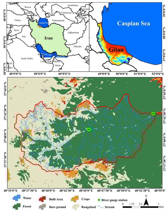 Geographical location and the stream network and river gauge stations in Navroud Asalem Forested area.