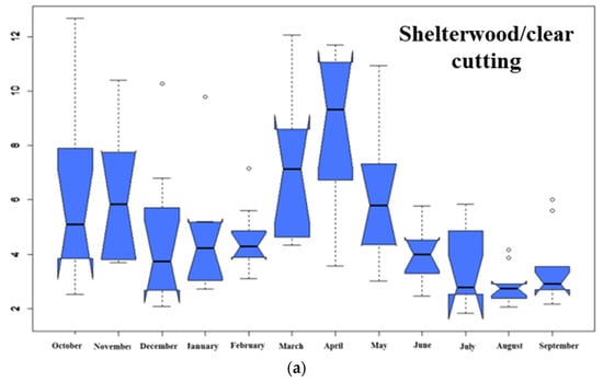 - Coefficient of Variations: highlights greater flow variability in Shelterwood/clear cutting, with higher percentages (e.g., October: 53.04%) compared to Femel cutting (e.g., October: 25.17%).