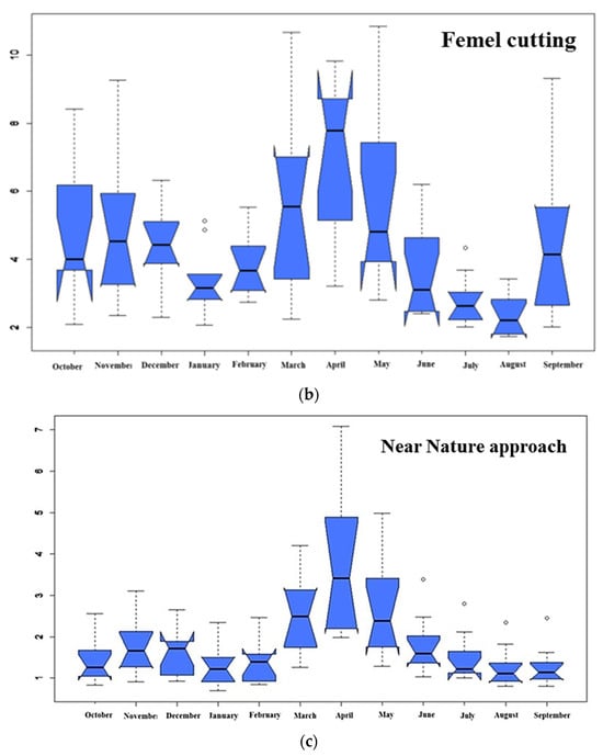 Box plots of monthly flow values during different logging periods at Kharjegil station, (a) Shelterwood/clear cutting, (b) Femel cutting, (c) Near Nature approach.