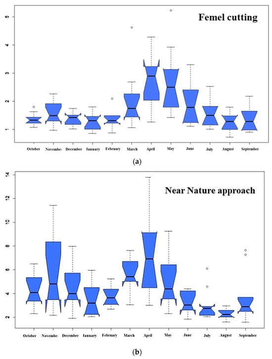 The comparison of the box plots if Figure 5 indicates a reduction in the range of flow values (fluctuations) in different months of the year for the Near Nature approach compared to Femel cutting. Additionally, the pattern of changes in flow values among different months in the two logging periods, Near Nature and Femel cutting, is almost similar.
