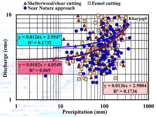 From Figure 6, it can be stated that during the Shelterwood/clear cutting period, the tree clear cutting significantly altered the natural relationship between precipitation and runoff production. The R square values presented in Figure 6 and Figure 7 only show the relationship between discharge and precipitation. In other words, it can be said that the lower the value of R square obtained based on the data from a specific exploitation period, the more changes occurred in the internal correlation of the discharge and precipitation variables, which may be very be low.