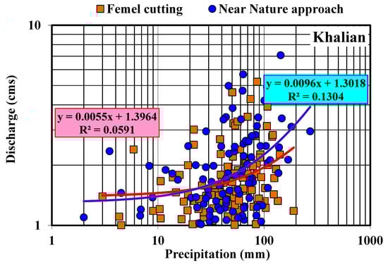 Considering the results shown in Figure 7, a higher correlation between precipitation and monthly flow values at Khalian station was observed in the Femel cutting logging period, with a coefficient of determination of 0.059, while the correlation between precipitation and monthly flow values in the Near Nature approach logging period had a higher value of 0.130.