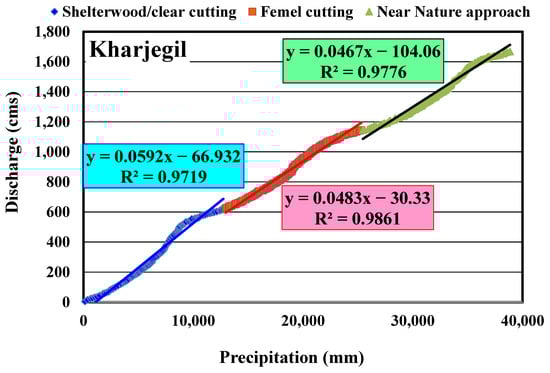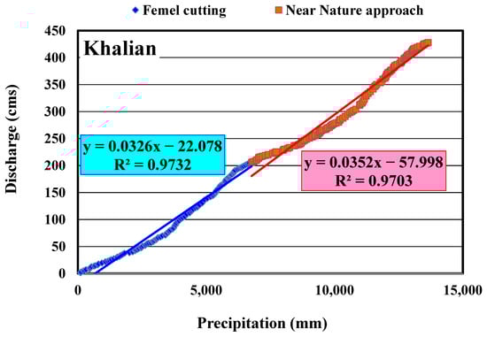 In Figure 8 and Figure 9, each part of the graph corresponds to one operation/exploitation period, and as mentioned in the research method, all three forest exploitation periods were applied at Kharjegil station, and there were only two forest exploitation periods at Khalian station. In other words, the different periods separated on the graphs show the values of cumulative precipitation per cumulative discharge related to each period of forest exploitation. It is clear that the separation of periods will help to evaluate the different impact of exploitation methods on the relationship between cumulative precipitation and cumulative discharge. In the comparison between different periods, it is possible to point out the effect of different methods of exploitation on the change in the slope of the DMC curve.