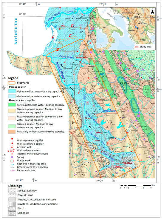 Hydrogeological map of the study area (according to the hydrogeological map of Albania, 1:200,000).