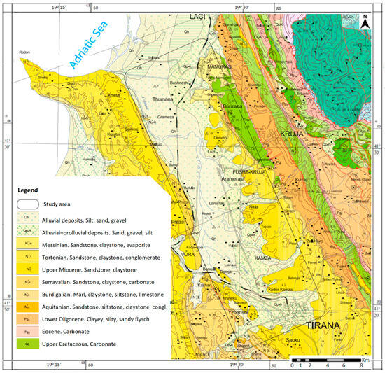 The study area is located in the Tirana–Ishmi syncline [23,24,44]. The hills surrounding the study area from the east, west and south consist of Upper Miocene molasses composed of Serravalian (), Tortonian () and Messinian () age deposits (Figure 2) [22] represented by intercalations of coarse-grain sandstone layers with siltstone and clay layers [22,45,46]. The upper geological section of the area consists of prolluvial (Qp–h) and alluvial (Qh) Quaternary deposits. The thickness of the prolluvial deposits varies from 3.0 m to 8.0 m [47]. They are mainly composed of gravel, sand and siltstone originating from the erosion of the hilly slopes and river and stream beds. They extend mainly to the east and south of the study area. In the western part of the area, they form a narrow strip along the foothills. [22] (Figure 2). The alluvial deposits (Qh), which cover the central and western parts of the study area, are represented by the terraces of the rivers that cross the area. The alluvial deposits are composed of gravels, sands and clays [21,45].