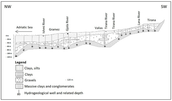 Schematic hydrogeological longitudinal cross-section of the Tirana–Ishmi aquifer.