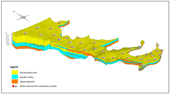 Each SINTACS parameter map and the GWV map were prepared through ArcGIS software [93], while the aquifer 3D model was created based on the interpolation of 35 water wells’ data, using the Groundwater Modeling System (GMS), version 10.7 [59].