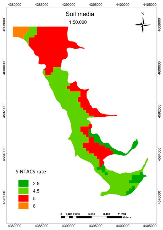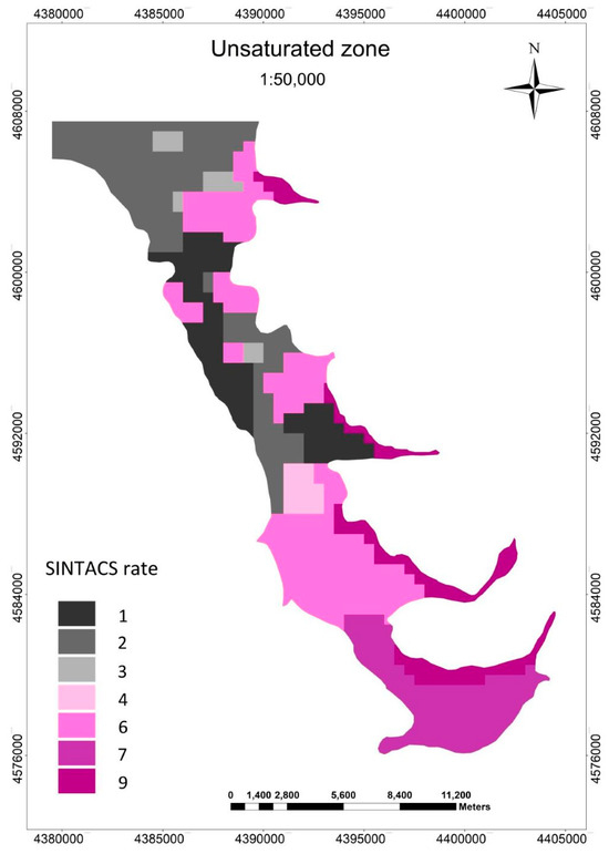 Table 5 provides the lithotypes of the unsaturated zone and the respective SINTACS range corresponding to alluvial deposits [92], while Figure 7 shows the map of the unsaturated zone parameter.