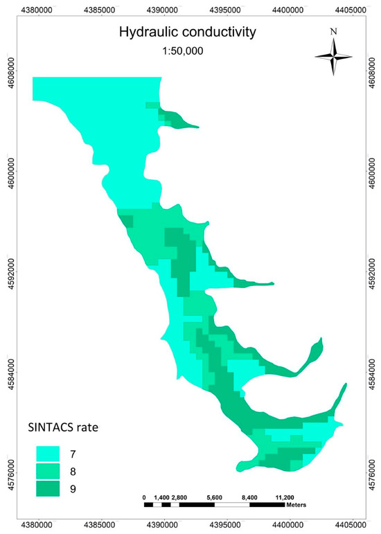 The water table depth parameter map (Figure 5) shows that roughly up to 65% of the study area’s surface is assigned the lowest rates (1, 2 and 4) and up to 25%, rate 7, whereas the remaining 10% earns the highest rate (9). The lowest rate belongs to the confined parts of the aquifer, where the piezometric surface is close to the ground surface, whereas the highest rate is associated with the recharge zones located in the rivers’ terraces.