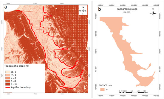 The SINTACS model uses five weighting strings which correspond to normal impact, high impact, with drainage, karst and fissured rocks [15]. Based on the geological and hydrogeological settings of the study area, and on its socio–economic aspects, the most suitable weighting string corresponds to normal impact. Table 1 provides the theoretical weighs for normal impact, in accordance with the provisions of the SINTACS method [92].