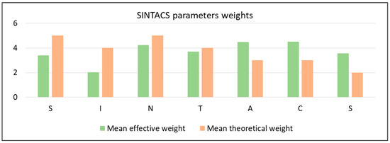 The single-parameter SA helps to compare the effective weights for each parameter to their theoretical weights [88] provided by the SINTACS method. Formula (3) calculates the effective weight for each polygon of the vulnerability map.