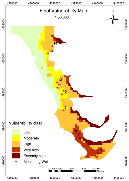 The validation of both the selected vulnerability model and the prepared vulnerability map serves to avoid any eventual subjectivity that may lead to an inaccurate assessment [86]. The validation was performed through a sensitivity analysis (SA), which expresses the effect of change in one factor on another one. SA influences the model formulation, calibration and verification [19], and helps to analyze the interaction between parameters, their appropriate range and spatial variability, and to identify the parameters having the highest impact on the model response and outputs, which in turn influence the model outcomes [94].