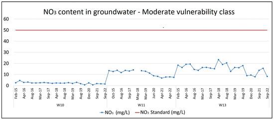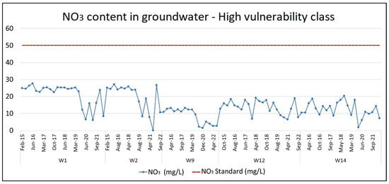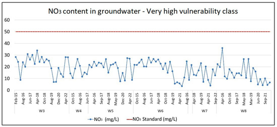 The accuracy of the selected vulnerability assessment method was validated using nitrates content (NO3 in mg/L), which is an anthropogenic pollution indicator. The NO3 concentration in groundwater is largely used and recommended worldwide for validating vulnerability assessment methods [84,97,98,99]. The nitrates content in the groundwater comes from different contaminants [100], including fertilizers and the municipal wastewater that flows into the local rivers and constitutes the main source of groundwater pollution in the study area [101,102,103]. The data on NO3 were taken from the State of Environment Report (SoER), which is annually published by the National Environment Agency (NEA) [104]. The monitoring period extents from 2015 to 2022.