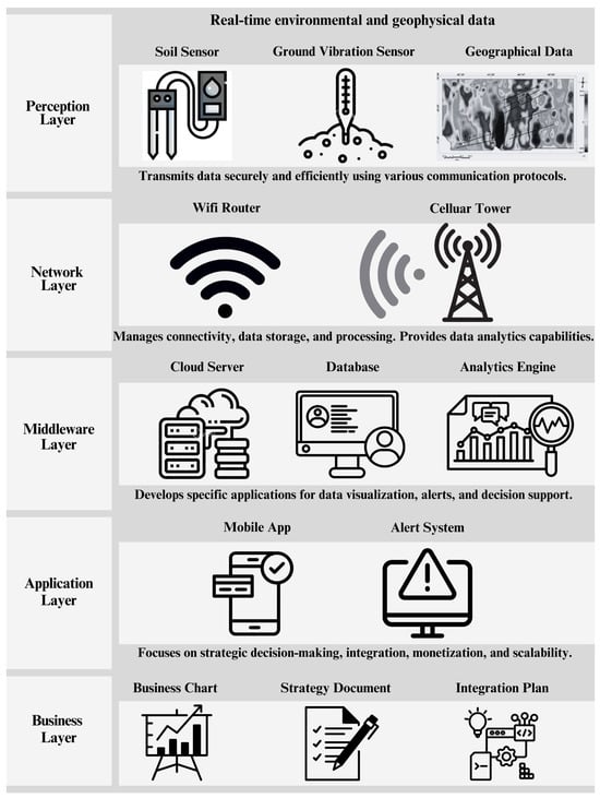Figure 4 shows the reference IoT architecture for landslide monitoring systems [173,180], which involves the following components and layers: