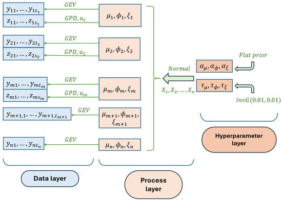 The annual maximum peak flows and high peaks over threshold extracted from the daily data are used as input to the Bayesian hierarchical model (BHM). According to the Bayesian paradigm, all model parameters are themselves viewed as random variables whose distributions are to be estimated. Classically, a BHM comprises three hierarchical layers: the data layer, the latent process layer and the hyperparameter layer. The structure of our model is summarized in Figure 3.