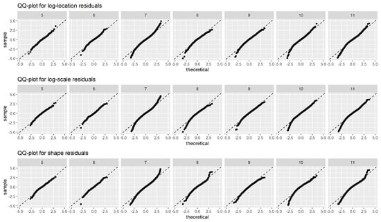 where notations follow those used in Section 2.2.2. Even though these quantities are not exactly differences between an estimated and observed value, we call them residuals for simplicity. Our BHM model assumes the residuals to be Gaussian random noises. Their normality is evaluated using normal quantile–quantile plots, as shown in Figure 5.