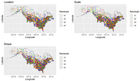 Spatial representation of the regression residuals, for the three GEV distribution parameters and for all gauged stations in regions 5–11. The residuals are classified into four groups splitted by the first, second, and third quartiles.