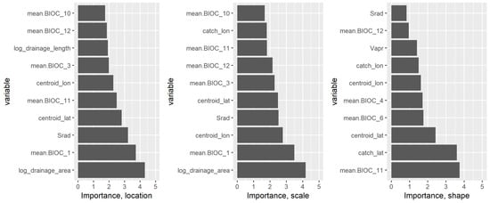 The drainage area is the most significant variable for predicting the location and scale parameters, confirming the scaling rule of the latter with the drainage area identified in the literature [,,]. It is absent from the top variables for the shape parameter, which tallies with the former authors’ conclusions that this scaling relationship is not supported for the shape. For the location and scale parameters, the most relevant variables are similar: the drainage area is closely followed by the annual mean temperature (mean.BIOC_1), solar radiation and the location of the centroid of the catchment’s drainage area (centroid_lat and centroid_lat). Temperature-related bioindicators are very significant in our model for predicting peak flows, with four of them present in the top ten variables for both the scale and location parameters: apart from mean annual temperature, the other relevant covariates are the mean temperature of the coldest quarter (mean.BIOC_11), isothermality (mean.BIOC_3) and the mean temperature of the warmest quarter (mean.BIOC_10). Temperature is closely correlated with snowmelt, which can play a major role in controlling the flow regimes in some regions under study. For the shape parameter, the most significant variables are the mean temperature of the coldest quarter (mean.BIOC_11) and the catchment and drainage area centroid latitudes.
