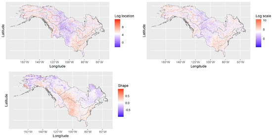 We chose to apply the model independently for each HydroBASINS level 2 region, where hydrological behaviors are assumed to be relatively similar, as opposed to having a unique unified model for the whole North America. Attempts to develop such a model showed a drop in model goodness-of-fit, which can be attributed to the heterogeneity of flood regimes and climatology across the continent. As a matter of fact, the Koppen–Geiger classification of climate zones in North America consists of 5–6 big climate zones, with marked variations depending on the latitude and elevation []. Despite independently fitting the model to different regions, border effects seem to be negligible judging by the spatial pattern of the estimates of the GEV distribution parameters (Figure 8) and extreme return levels (Figure 11).