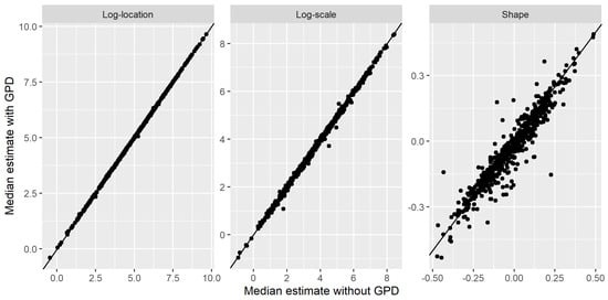 where and refer to the estimates made with models M1 and M0, respectively. Differences in the estimated values of the location and scale parameters are negligeable. These parameters are easy to estimate and incorporating POT data in the model does not modify their estimations (MRAD of 0.2% and 1.5% for the location and scale, respectively, when incorporating POT data). The comparison shows more difference for the shape parameter, which is harder to estimate accurately. Including POT data adds useful information which applies a correction to the estimated shape values in some cases. The induced MRD is negligeable (3.5%) but the MRAD is significant (22%), when using additional peak-over-threshold discharge data for inference of the shape parameter.