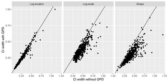 Comparison of GEV distribution parameter 95% credible interval width for the BHM model without peak-over-threshold data (x axis) and our BHM model (with additional peak-over-threshold data). The comparison is performed for all stations in region 9 where daily discharge data are available.