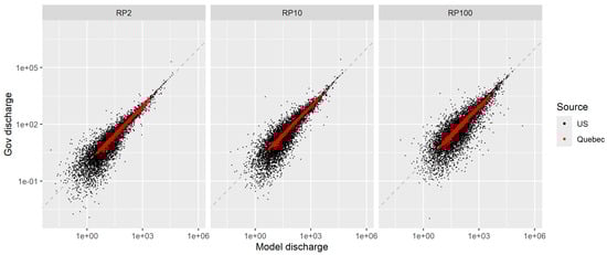 To further validate our extreme discharge estimates, we compare the 2-, 10- and 100-year return period discharge values with corresponding return levels from two governmental sources: PeakFQ Program from USGS National Water data for the USA [] and Ministère de l’Environnement et de la Lutte contre les changements climatiques for Quebec []. We did not find public return level data available for other areas in Canada. This comparison with governmental data is possible for around 21000 catchments in regions 5–11, with dense coverage over southern Quebec and all US territory except for Alaska. It is meant to verify the plausibility of our discharge estimates, though differences might arise due to different estimation methods. The US peakflows are calculated using the Log-Pearson type III distribution with several manual adjustments, while for Quebec, the best statistical distribution is used to fit well-behaving stations locally, based on statistical criteria and graphical assessment. In Figure 12, discharge estimates for the 2-, 10- and 100-year return periods from our model (x axis) are compared with those from government sources (y axis). There is a slight positive bias for small discharge values in our model compared to official estimates, but generally, the overall bias is small. The spread of points indicate that our discharge estimates do not perfectly match the government estimates. Nevertheless, the reported median relative errors are 14.5 % for RP2, 14.5 % for RP10 and 18.6 % for RP100. The comparison is quite similar for the three return periods (low, medium and high extreme discharge values), indicating that differences from government sources arise from the bulk of the extreme discharge distributions rather than the tail. Interestingly, Figure 12 also shows that estimates from the Quebec government match our estimates much more closely than US data. Overall, the comparison shows a satisfying agreement between our estimated peak flows and government-sourced peak flows.