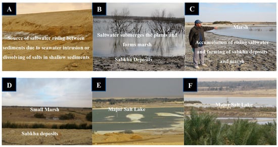 Field photographs (A–F) represent the main surface phenomena due to the rise and accumulation of saltwater and salts on the surface of the sediments, and the formation of salt lakes, sabkhas, and marshes because of seawater intrusion.