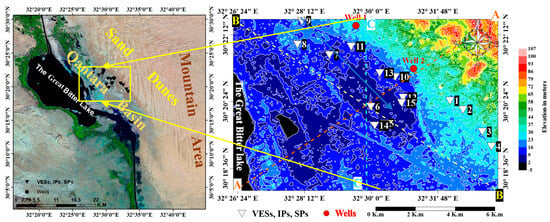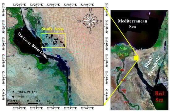 The study area is located northwest of the Sinai Peninsula near the Suez Canal, Egypt, specifically east of it, next to the Bitter Lakes. The area is located between latitudes 30°19′11″ and 30°22′50″ N, and longitudes 32°28′00″ and 32°33′20″ E (Figure 2). This area is characterized by a dry and semi-arid continental climate. The temperature ranges between 15 °C, in the winter, to 35 °C or to 40o C in the summer. Rainfall generally increases in the winter, except for the southern areas, where it falls. Rainfall occurs at distant annual intervals, and sometimes the rain reaches torrential rains, and its average rainfall ranges between 80–90 mm/year.