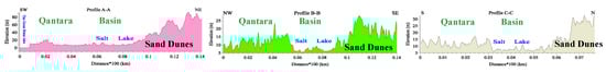 The topographic profiles (A-A), (B-B), and (C-C) and their directions along the study area as distributed in the topographic map (Figure 3, right panel) (Distance × 100 km and Elevation in m).