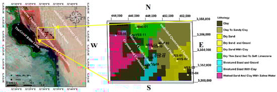 The application of Direct Current (DC) resistivity (VESs) and Direct Current Time-Domain Induced Polarizations (IPs or TDIPs) as geoelectrical methods provides an interesting indirect methodology in many branches of earth sciences such as geology, environmental geology, hydrogeology, etc. The presence of groundwater in sediments is usually important evidence for qualitative and indirect inference in predicting the hydraulic conductivity of subsurface sediments, and give indication about the presence of aquifer. In general, hydraulic conductivity is one of the important parameters of aquifers which can be calculated using geoelectrical methods [,,,]. So, if the hydraulic conductivity of these sediments is moderate to high, this will give an indication that they are not clayey or have low clay content. Also, if the type of groundwater is saline, it is difficult to predict and estimate the hydraulic conductivity of these sediments, which affects the identification of sediments and their types, especially in complex sedimentary facies as recorded in the study area. These types of facies are saturated with saline and fresh groundwater as well as brackish groundwater. Therefore, to distinguish between these facies and their groundwater types, the resistivity method and the induced polarization method will be used.
