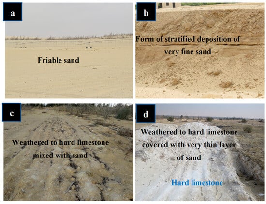 In general, the thickness of the Quaternary deposits, which consist of previous formations in addition to ancient beach sand deposits and limestone with sandstone (Kurkar formation), is ~80–100 m. Ancient beach sand deposits consist of multi-grained sand with alternations of gravel and sandy clay layers. These deposits are located on top of limestone and sandstone deposits, which belong to Pleistocene deposits, and their thickness ranges from 20–60 m. As for the sand dune deposits, which cover the sand deposits that extend on the beach, they are often intercalation with sediments containing clay or gravel. There is also a layer of impermeable clay beneath it. Also, it represents a shallow aquifer with a thickness of ~20–30 m. All of these pre-Holocene and Pleistocene deposits reach a thickness of 100–130 m and may reach ~200 m and they are separated from the pre-Quaternary sediments by deposits of clay, shale, limestone, and sand (Figure 5, right panel). The photographs in Figure 6 represent the prevailing surface sediments along the area.