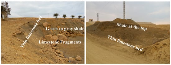 Miocene-age sediments: which appear to be exposed in the area, are divided into two basic rock units, the lower part of which consists of sandstone, shale, and limestone, while its upper part consists of white limestone with intercalations of marl and chalky limestone (Figure 6c,d).