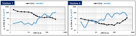 The shallow geoelectric survey in this study includes Direct Current (DC) resistivity (VES) in Ωm and Direct Current Time-Domain Induced Polarization (DC-TDIP) in mV/V% methods. This survey aims to explore and determine the geological (lithological anisotropy) and hydrogeological conditions of surface and subsurface sediments, as well as their geometric dimensions in the horizontal and vertical directions. It will also be focused on identifying the type of saturated groundwater for the sedimentary facies. To conduct this study, fifteen (15) measurement stations were measured for each method, meaning that each station includes the two methods, or 15 measurement stations for each method, for a total of 30 stations, as distributed in Figure 2, Figure 3 and Figure 5. These measurements were made by staff of the Research Institute of Groundwater (RIGW) using the SYSCAL R2 device and the Schlumberger range application with a distance of 300 m to 700 m between the current electrodes (C1C2/2). The measured data from two methods include the apparent resistivity in Ωm and the chargeability in mV/V%. Figure 8 represents two examples about the measured data in form of curves in the freshwater area (station 1) and in the saline water area (station 6). For an array of current electrodes as the used Schlumberger array, C1 and C2, and potential electrodes, P1 and P2, the resistivity (Ωm) is calculated by the following Equation (1):