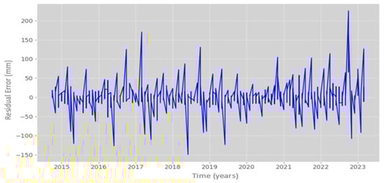 Finally, the model’s predictions were evaluated, achieving an 81% similarity to the observed precipitation in both training and test datasets, with residual errors averaging 27.98 mm compared to the actual measurements. The error trend across most data points exhibited a mean of zero and a uniform variance, although there were instances where the residual error exceeded 200 mm, as illustrated in