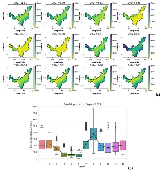 The results from the LSTM model indicated significant seasonal variations in precipitation, with a notable dry period forecasted for the second quarter of 2024, particularly in May and June, followed by a transition to wetter conditions in the third quarter. The model’s ability to predict such transitions is crucial for water resource management, agricultural planning, and disaster mitigation strategies, especially in regions with variable climatic conditions, like Boyacá, where 24% of Colombia’s páramo areas are located. The accuracy of the LSTM model in predicting extreme precipitation events, such as those expected in August, with up to 700 mm of precipitation, will be highly beneficial for early-warning systems in flood risk management.