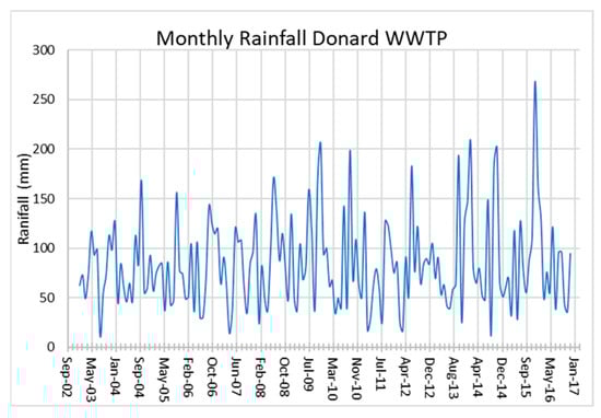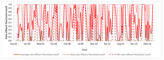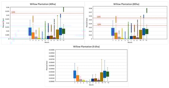 - Actual site runoff includes the following: (a) The monthly net proportion of rainfall minus soil moisture and minus willow actual evapotranspiration; (b) The effluent flow from WWTP, for which two scenarios have been set up associated with 500 PE, and two scenarios relevant to wastewater flows of 120 L/PE/day and 150 L/PE/day.
