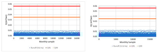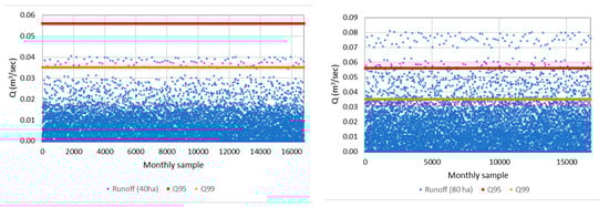 - The final model step refers to the exceedance probability density of the monthly plant surface runoff against low flow estimates (Q95 and Q99) at the adjacent tributary for quantifying the likelihood of the river’s quality deterioration.