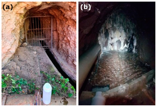 The water samples were taken at the tunnel entrance, whose position was referenced using UTM (Universal Transverse Mercator) coordinates. For this study, an annual water sample was analyzed from each tunnel from 2011 to 2021. Figure 3 shows a photograph of the entrance to a tunnel with its water collection point and the end of the tunnel, where one can see how the water comes out of the aquifer [29].