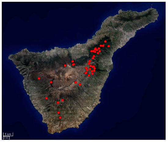 Distribution of groundwater tunnels studied (red points) (tunnels referenced as Ref. 1 to Ref. 45 in Appendix A, Table A1, Table A2 and Table A3) on the island of Tenerife, Canary Islands, Spain.