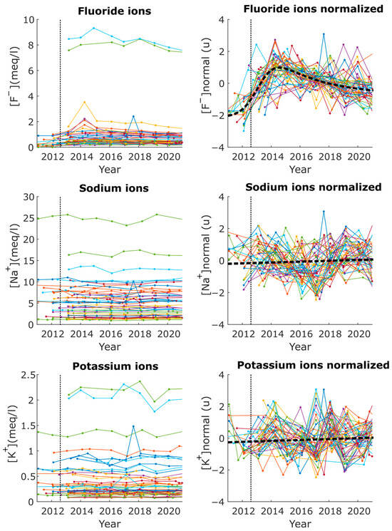 For this study, 45 tunnels were selected, distributed throughout the island of Tenerife, and a total of 435 water samples were analyzed. A water sample was extracted annually from each tunnel between 2011 and 2021, and the F−, Na+, and K+ values of each were determined. The values obtained for each water sample from each tunnel are shown in Figure 5, the normalized values of concentration. The values for each tunnel, j, were normalized to their mean value (μj) and standard deviation (σj) (Equation (1)).