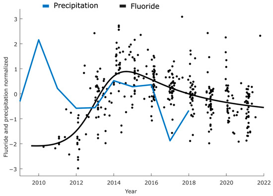 Normalized average precipitation and F− concentration: Black dots represent the F− concentration in 45 groundwater tunnels, while the black line illustrates the modeled F− concentration in water. The blue line denotes the average precipitation recorded at the meteorological stations.